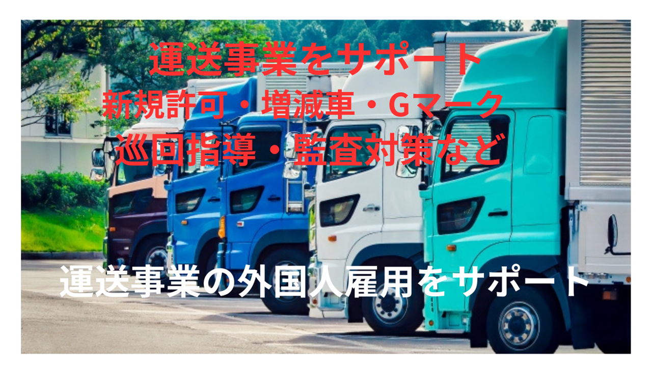 一般貨物・旅客自動車運送事業の許可・認可・事業報告や巡回・監査対策、貨物軽自動車運送事業の届出など。